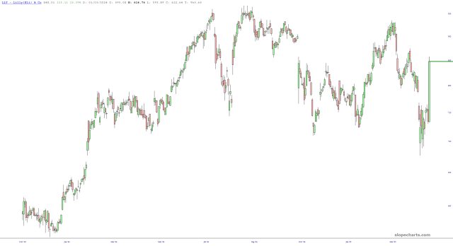 As the VIX eases down into the lower 30s (!) I wanted to offer up a less wild and wooly short: HYG, the high yield corporate bond fund. It has a clean stop at 77.85 (I’ve set mine at 77.90; this is a new trade) and, frankly, doesn’t tend to move crazily like, say, oh, something like LLY.