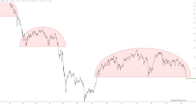 My thesis all this time has been BUY gold and SHORT equities, based on this chart. For oh so long, the charting was hammering out its top, teasing us with its completion.