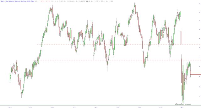 As I ceaselessly mention when this topic comes up, I don’t trade oil or USO, but instead focus on energy producers. The XLE fund is now nicely this morning, below that gargantuan mass of overhead supply.