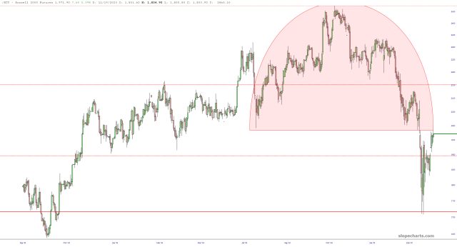 The longer-term picture of the /RTY illustrates its powerful reversal potential. That is an impressive amount of overhead supply, highlighted in pink.