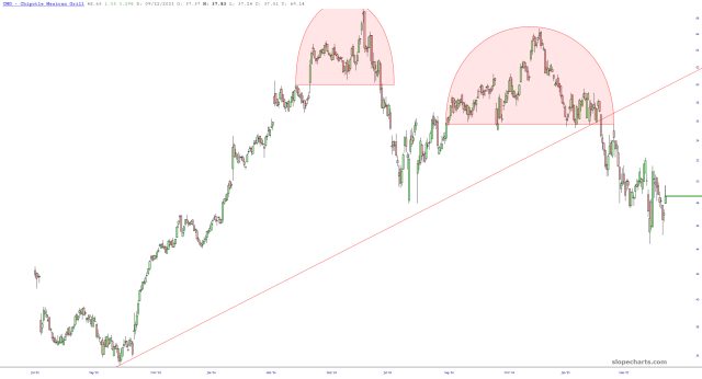 I owned September puts on CMG for a long time, but I sold them this morning for several reasons. First, I’m moving away from options and sticking with straight equity plays; second, the chart isn’t that great, and third, I’m just way too nervous to hold in this kind of environment. All of which is to say that CMG is guaranteed to plunge, now that I’ve dumped those puts.