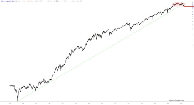 My biggest non-ETF equity short is the most boring-sounding: Pepsi Corporation (PEP). It’s actually a honey of a pattern, however, having hammered out a beautiful and massive rounded top spanning nearly half a decade (!).