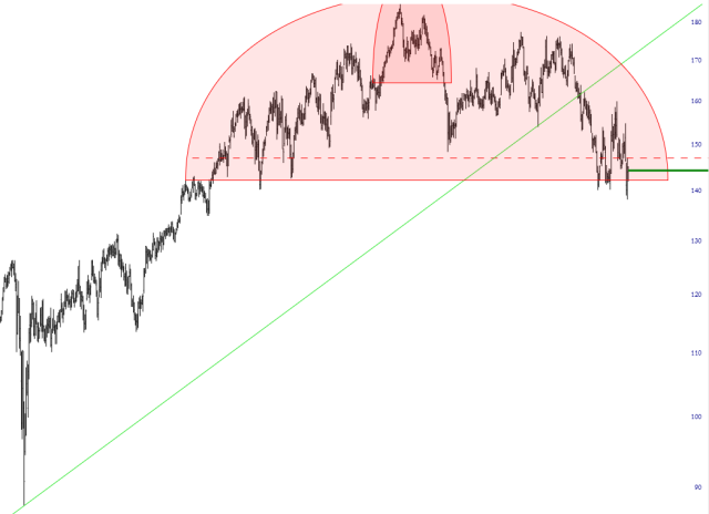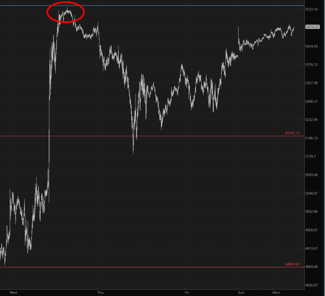 More importantly, however, let’s take a good, hard look at the /ES chart. The 5-minute bar graph below shows the /ES from last Wednesday morning (before the white flag of surrender was hoisted and all countries except China were excused) until just now (which is when the one remaining country, China, was for all practical purposes let off the hook).