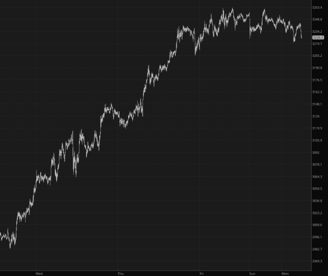 As such, markets are celebrating since D.C. has done everything but surrender at this point. (If you want huge laffs, just watch the Liberation Day speech again, which was offered up with the same gravitas as Operation Overlord). Equities are up about 1.5% to 2%, more or less. On in particular, Apple, has shot up by double digits, since the notion of triple-digit tariffs has vanished with the weekend.