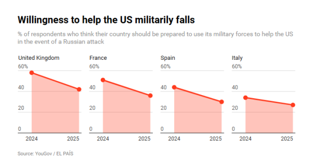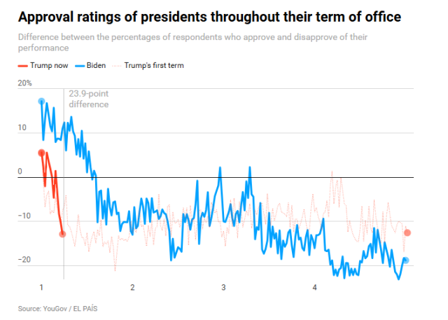 Performance of the stock market for various modern PresidentsGDP ForecastWhat our friends up north think of usChange in approval ratings from Day 0 for Trump 45, Biden, and Trump 47How eager other countries would be to help us outHow the U.S. is perceived by various European countries