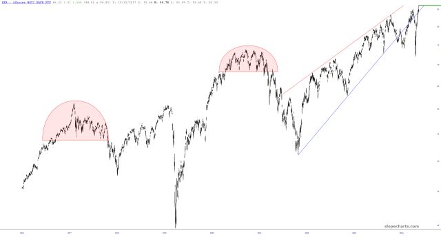 There is one outlier out of my newly-updated count of 20 positions which is fairly indefensible, however. I have cut its size in half, and through gritted teeth, I am hanging on to this short. Its symbol? EFA, of course!