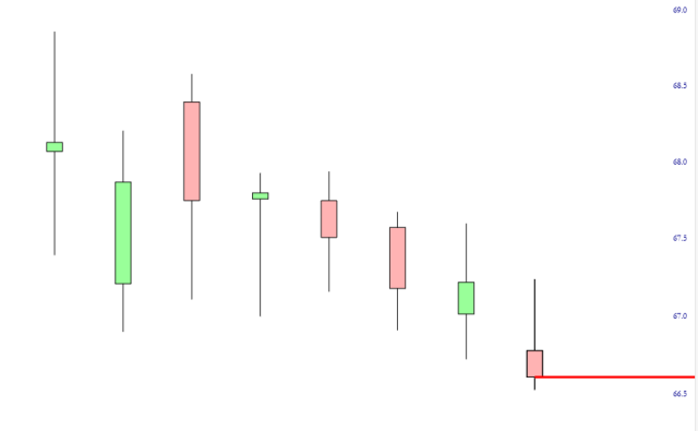 One of the few consistent performers I’ve had lately is snack-maker Mondelez (MDLZ) which, unlike every other equity out there, has been drip, drip, dripping lower each day.