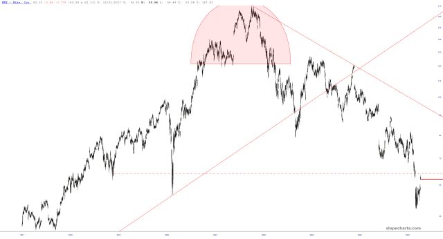 Having lost about 70% of its value since it peaked, shoe-maker Nike (NKE) has enjoyed a bounce in recent weeks thanks to the cessation of the trade wars. I would like to emphasize that the massive top is still intact, with an important price gap at 64.16: