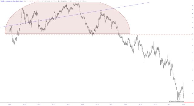 One of the great head and shoulders tops in recent memory continues to lay waste to Jack in the Box (JACK):