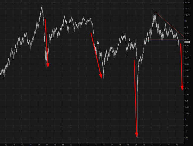 All right, fellas (and Violet), I can see the spirit is willing, but the flesh is weak. I’m having a grand old time this morning (having woken up at 3:30 a.m., which is when the markets open in Tahiti), yet I’m seeing a lot of chatter about the market closing green and bears getting wrecked and so forth. Take a big step back and look at the /RTY (which, incidentally, has completely bashed in Scott Bessent’s pretty hairdo).