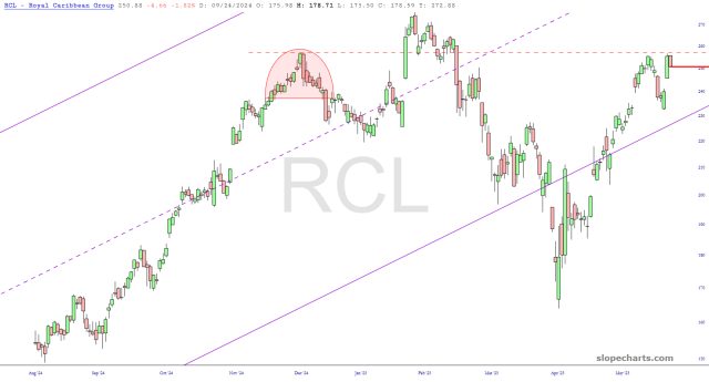 I also stick have it in for Royal Carribean, whose horizontal (anchored to the price extreme of that pink tinted zone on the left) is my stop-loss.