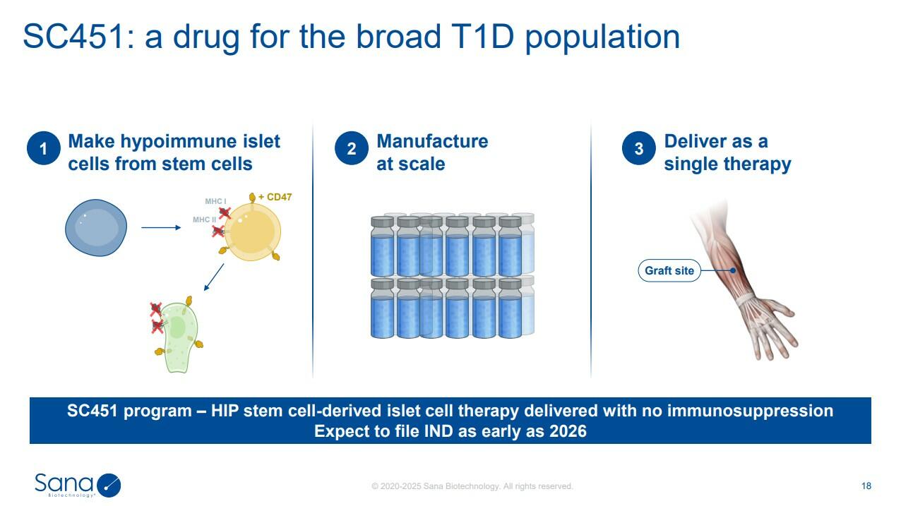 Type 1 diabetes occurs when the immune system destroys the pancreatic beta cells, which are responsible for producing insulin. While transplants of donor islets—clusters of cells that include beta cells—can restore insulin production, they require scarce donor tissue and lifelong immunosuppressive drugs, which carry serious risks. As a result, insulin remains the only practical treatment for nearly all Type 1 diabetics. Sana has successfully engineered donor-derived islets to evade immune rejection, enabling a Type 1 diabetic to produce his own insulin, without the need for immunosuppressive drugs.