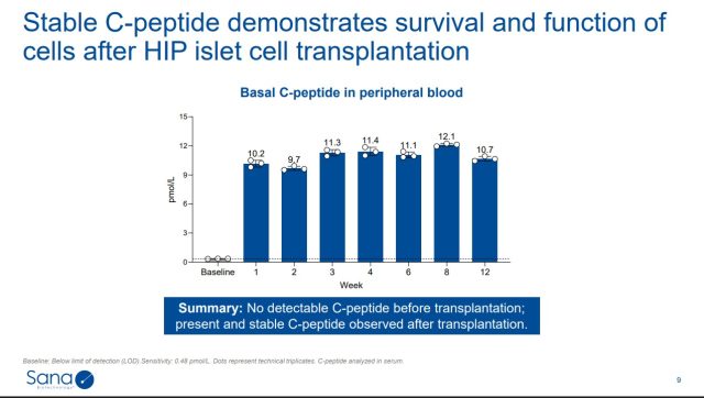 A recent presentation by Sana shows the results of this experiment so far. The C-peptide mentioned there is a biomarker of insulin production.