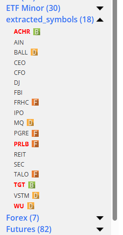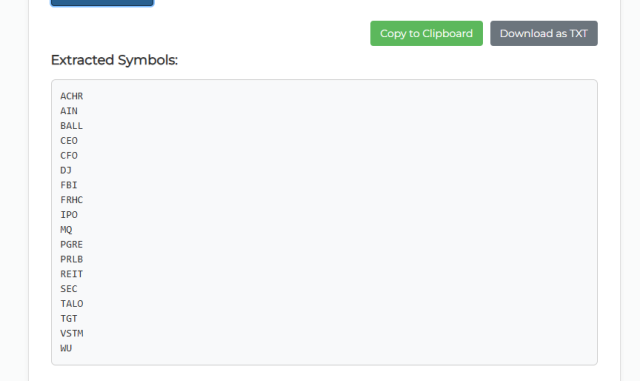 I would then click the Extract Symbols button, and, voila, it has teased out the symbols, put them in alphabetical order, and provided me a means to copy them to my clipboard or download them into a .TXT file so I could, for example, import them into SlopeCharts.