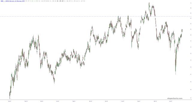 The XME/GDX relationship has held true for decades, and after completing a substantial top and plunging hard, it has recovered almost back to the base of its top.