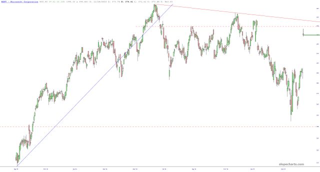The entire market is raging higher including, sadly, the small caps. MSFT and META provided the gasoline for the fire, but I did want to point out something about both of these: they essentially opened up at their highs and have been selling off ever since. That little fact isn’t fazing the market, but just FYI, here we have Meta slipping beneath its open: