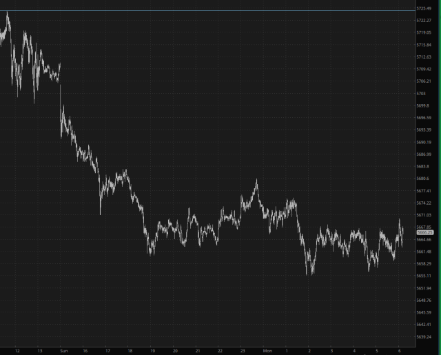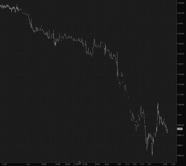 For the first time in two weeks, I don’t have to grit my teeth in anticipation of a horrible opening bell. We’ve got drops of almost 1% across the board, which I’ll gladly take. Here’s the slow burn on the /ES all night, away from its absolutely ridiculous lift last week: