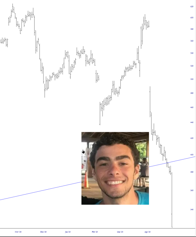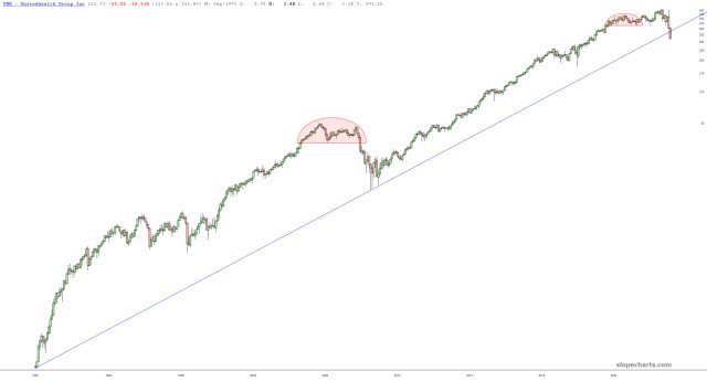 Even on a monthly bar scale, with a timeline measured in decades, UNH has cracked its lifetime trendline. Not long ago, one could argue (as I did) that the tagging of the trendline might represent a buying opportunity, but that trendline cracked soon thereafter, and a broken trendline ain’t the same thing as an unbroken one.