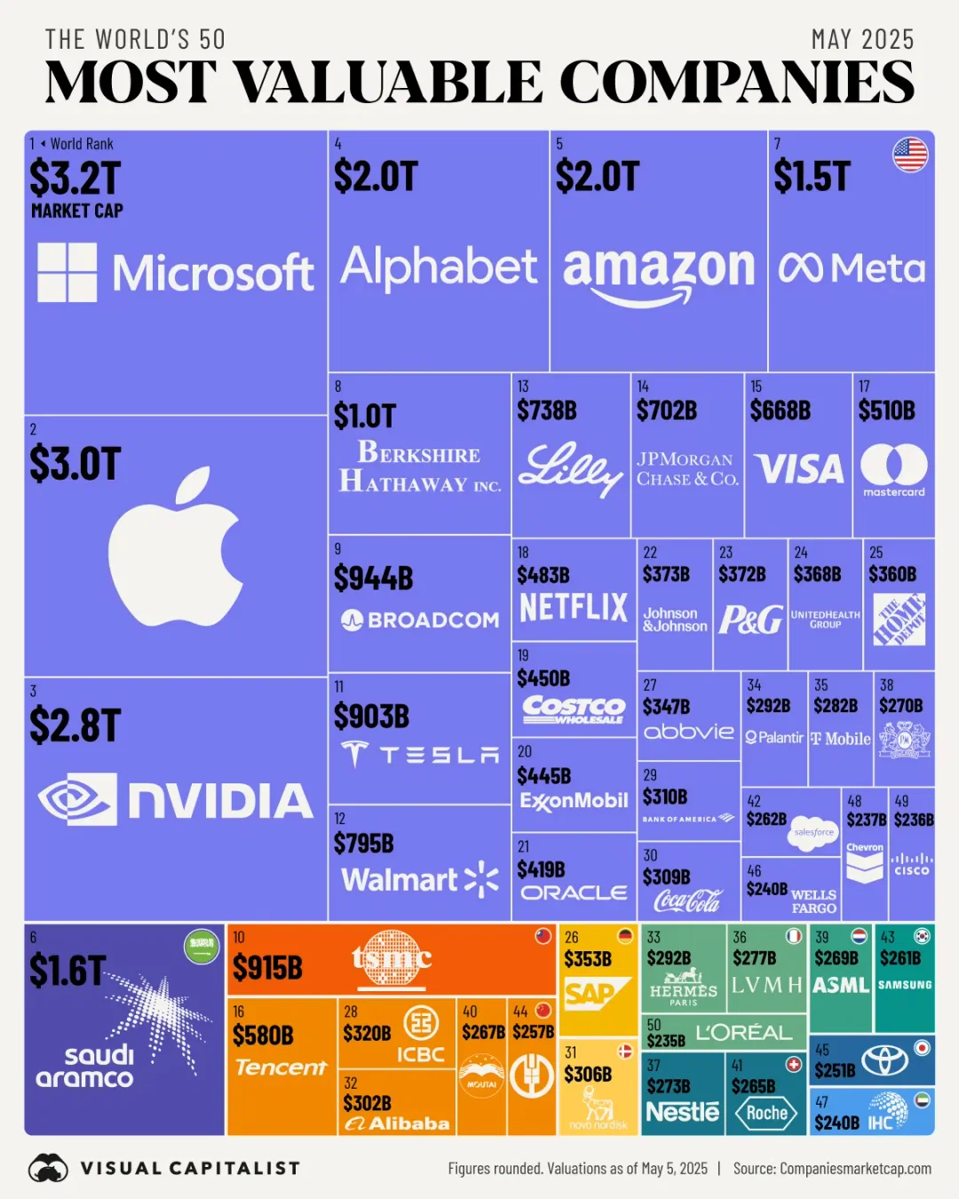 Here’s an updated diagram of the most valuable public companies. As a reminder, you can get the historical market cap for any stock on this special page, and you can get a sorted list of the biggest market cap firms on this ranking page.