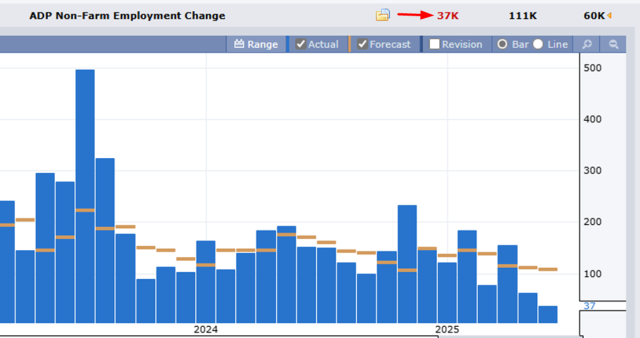 The ADP employment change report came out this morning, and, as it was the month before, it fell well short of expectations. Whereas the predicted increase in jobs was 111,000, the actual number was one-third that level. As you can see, the ADP figure has been generally shrinking for the past eight months, so there’s definitely a weakening trend in the wonderful world of job creation.