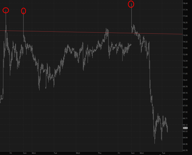 This morning is relatively calm compared to twenty-four hours ago. The big event yesterday was the plunge in crude oil prices whose drop was slightly augmented on the news of an Israel/Iran ceasefire (which, evidently, didn’t even make it through one night). As of crude is down again about another 3%, as it tries to find stability in the mid-60s (HALF the amount the JP Morgan ninnies were screeching about just a few days ago).