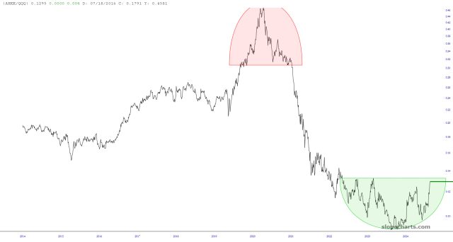As much crap as I’ve given Cathie D. Wood over the years, I’ve got to say that her ARKK fund has really turned the corner. As you examine the ratio chart of ARKK to QQQ, you can see how ARKK has hammered out a very impressive base and looks like it could potentially execute a powerful breakout. This could represent as important a bullish event for Ms. Wood in contrast with the bearish top (pink zone) which presaged the relative wipeout of ARKK compared to tech stocks in general.