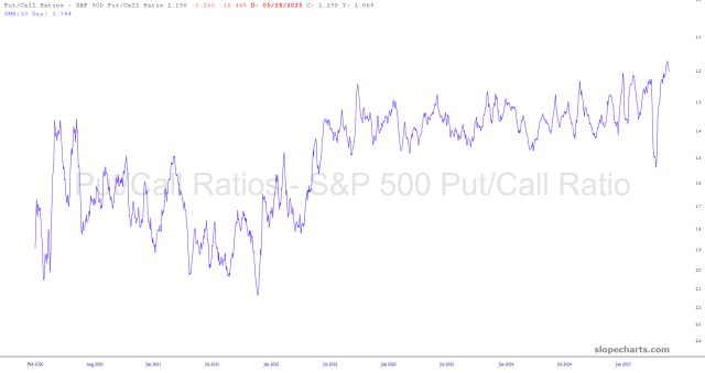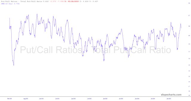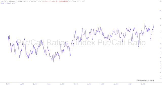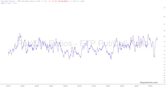 I read an article from our friends in Gainesville that gave me an idea to share. What the boys at EWI do is take the put/call ratio (which we now have in SlopeCharts) and do two things to it: (1) they create a 10-day moving average to smooth it out (2) they invert the scale so that a chart basing and curling up indicates a bottoming market overall, and a chart topping and starting to curl down means just the opposite.