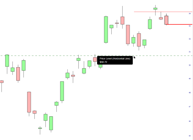 Looking closely at GDX, we can see at the moment a bearish engulfing pattern. I’ve tightened up my stop to yesterday’s high, and the very first target is down at the 50.72 price gap. Take note that the “peak to trough” timespan on the $XAU chart spans YEARS, so this isn’t going to be a short-term trade. I might hang on to it for a while.