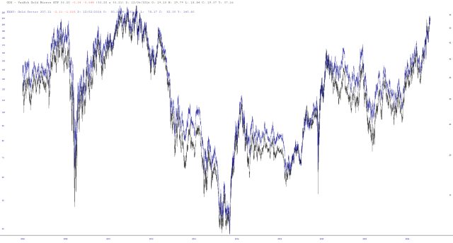 If you are curious how well GDX and $XAU track one another, look no farther than the layered chart, and you can see they move in lockstep.