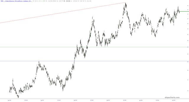 One way to play this is by way of TBT, the ultra-short-on-bonds ETF. As with any leveraged instrument, it’s a choppy beast, but it’s just about tripled over the past five years. Find me any other leveraged instrument which has done anything close to that (you won’t, since most of them just get ground into hamburger, since that’s the nature of the beast).