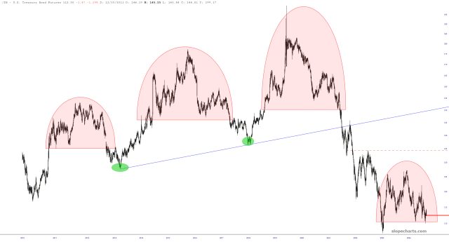 Looking at the multi-decade /ZB futures, you can see how, chunk by chunk, we’ve been breaking down. With $37 trillion in debt (and trillions more coming, thanks to a continued wealth transfer to the likes of Peter Thiel), the last thing the U.S. needs is higher rates, but that’s precisely what’s coming.