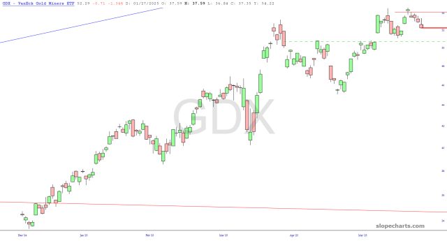 In turn, miners have softened up considerably. First support is at the green line, anchored to the price gap.