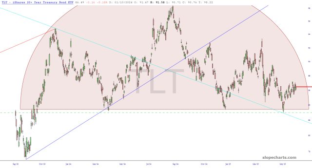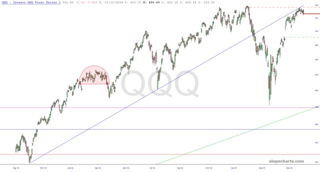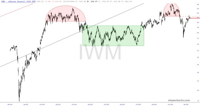 IWM is one of the most enticing patterns, with an analog between those two pink tops, and a clean stop-loss at the dashed red line.