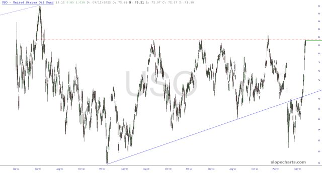 Oil has raged up to multi-year resistance. If things get truly out of control (like a nuclear bomb), I imagine the price bar will slap on turbo boosters above this dashed red line.