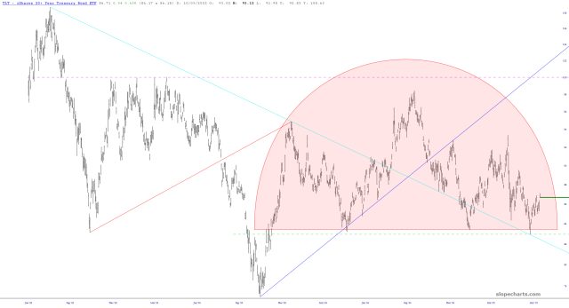 Oddly, longer-term debt instruments represented by TLT from the same government (the bankrupt U.S. of A.) is looking pretty sickly.