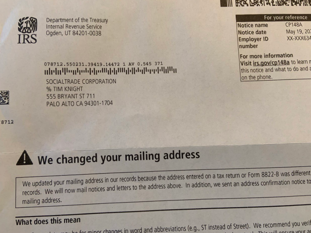 Have I, in fact, changed addresses? No, not for decades. So, what’s going on? Simple: the IRS has my street address has 555 Bryant St whereas m payroll processor uses the address 555 Bryant Street. That’s right. One uses Street, and the other uses the common abbreviation St, so as far as the IRS’s FORTRAN and COBOL code written in 1963 is concerned, I’ve changed addresses.