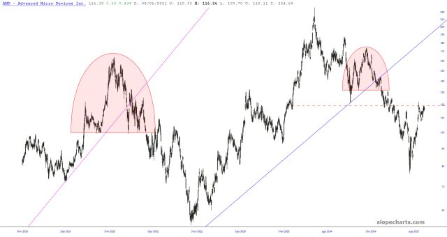 I’ve got to say, though, that they are plenty of intriguing short setups in semi-land, such as ON, MCHP, and AMD, shown below.
