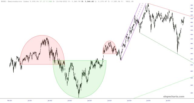 Perhaps the cleanest setup for a hard fall among all the indexes I am examining is the semiconductor index, symbol $SOX. It still has a little more potential upside before it hits its resistance trendline, but tagging this trendline is not a necessary prerequisite. The point is that there’s much more downside risk than upside opportunity at present price levels, and virtually all of the power behind the last two months of ascent is predicated on the continuation of AI Fever.