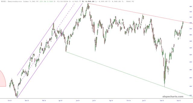 The thing is that index after index is at a crucial juncture, with a particularly good example being the semiconductor index, shown below. If we turn south, it will be a jaw-droppingly, pitch-perfect, technically ideal reversal away from resistance.