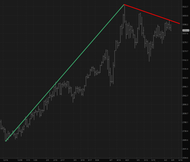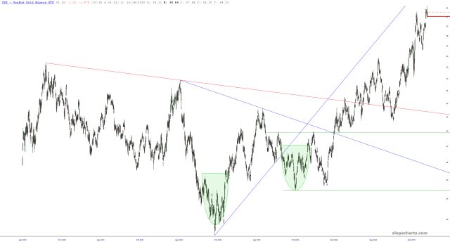 On this very rough day for equity bears, there’s just one “First Buddy” for me, which is GDX, my gold miners short. Over the course of the past half year, gold has generally done great, but it seems to have reached a peak in April (around the time that equities were wrapping up their final freak-out) and has been engaged in a series of lower highs since then.