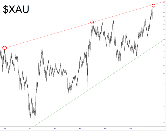Of more especial interest to me is the Gold Sector index, which over the very long term has hammered out a magnificent pattern. Recently, we got exceptionally close to major resistance, and yesterday I figured it was time to get into a GDX short, in spite of my overall enthusiasm for precious metals.