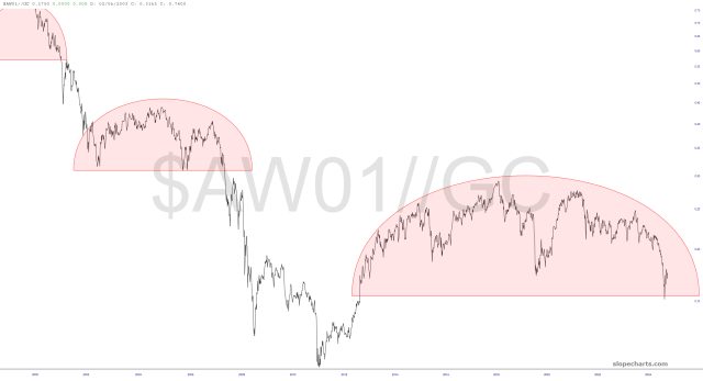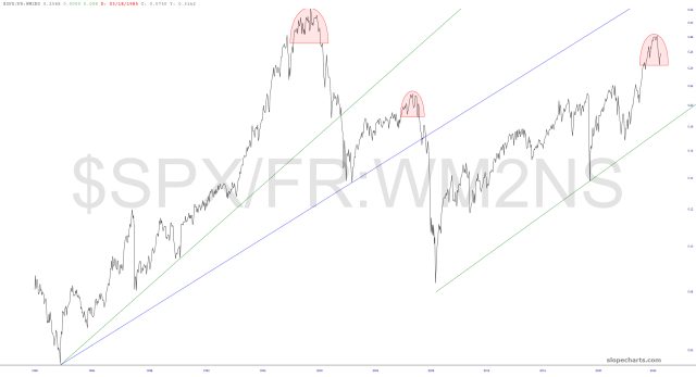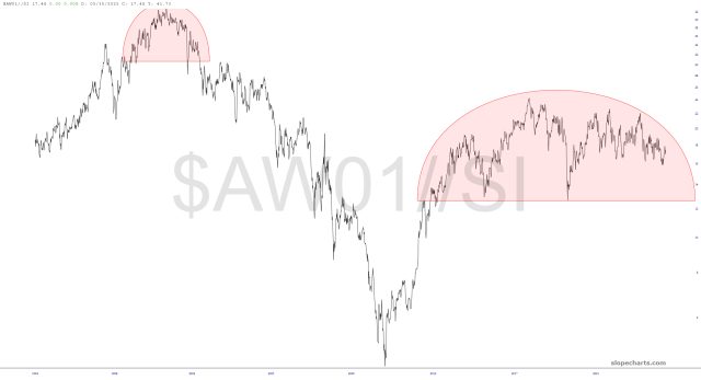 The first, which you’ve seen many times, is still playing out beautifully. The long-term theme is simple: bullish precious metals/bearish equities. This topping pattern is gargantuan and powerful.