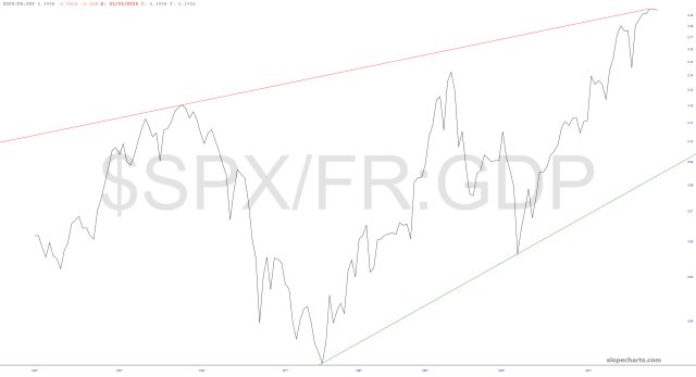 The multi-decade chart of the S&P 500 divided by the GDP shows that early this year we tagged the lifetime resistance trendline and that, relative to the economy, stocks have never been more highly-valued.
