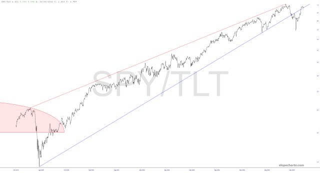 Most alluring of all, the wedge of the S&P ETF divided by the bond ETF plainly shows a crucial failure and a pitch-perfect retrace. A descent from this busted trendline seems to be the natural next step.