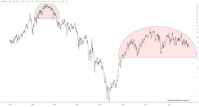 There’s an entire block of ratio charts which has the exact same assertion: long term, precious metals are going to beat the bejesus out of stocks. It has happened repeatedly already, and the present pattern in formation is much bigger and badder (unless you like gold!) than the rest. These charts have different equity components and different metals, but the conclusion is the same throughout.