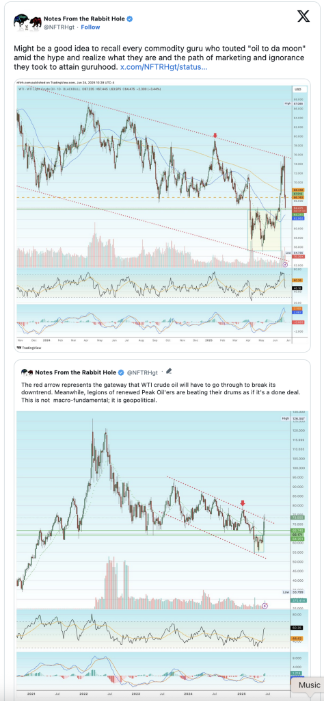Note that the X posts above did not receive much attention, or at least approval. That could be a sign of how aligned the herds were behind the touts claiming bombing = skyrocketing oil = inflation!!!!