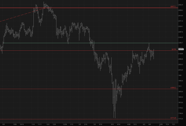 So, whereas we had survived the CPI, the PPI, and, most recently, the FOMC, and had found ourselves with the opportunity to completely ruin the bullish breakout, we are once again in the extremely risky zone between the bearish setup (everything above the green line) and the bullish setup (everything below the 2150 Fib).