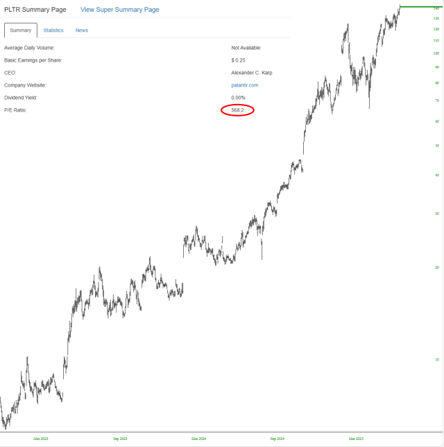 One good example of how entrenched the mania is can be seen with Palantir (PLTR) whose P/E of nearly 600 is no obstacle to the price going up to a lifetime high on a nearly daily basis.