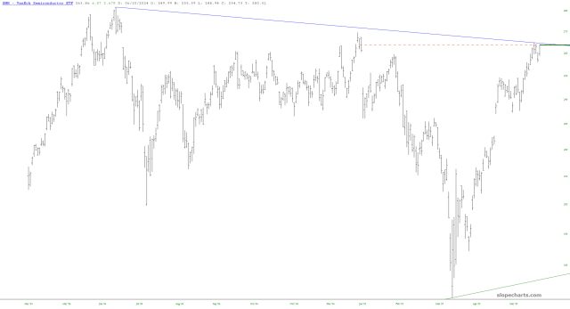 The semiconductor fund SMH is at the cusp of beating its former “lower high” as well as breaking above its trendline, busting the brief bout with bearishness in that sector.