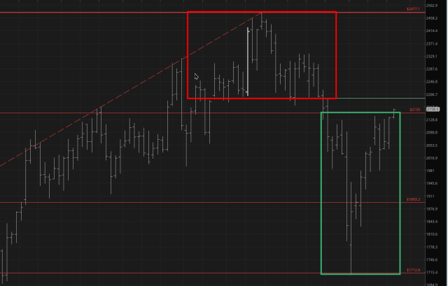 It’s all just noise at this point, though. The big face-off remains with the /RTY, with the bearish (red) and bullish (green) patterns ready for war. Hopefully by Wednesday morning, the victor will be clear.